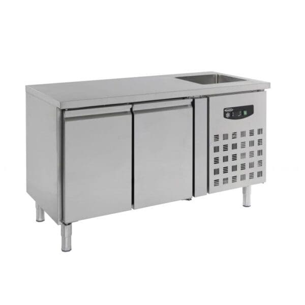 Dimensions table : 1510X700X960mm Puissances : 0,35 Kw en 230V Plage de température - 2°C / +8°C Dimensions Evier : 400X400Xh200mm Nombre de portes : 2 Dégivrage auto Contenu du GN 2X 1/1 Liquide de refroidissement R 600 A Poids : 115 Kg Vendu sans robinet (Hors Livraison)