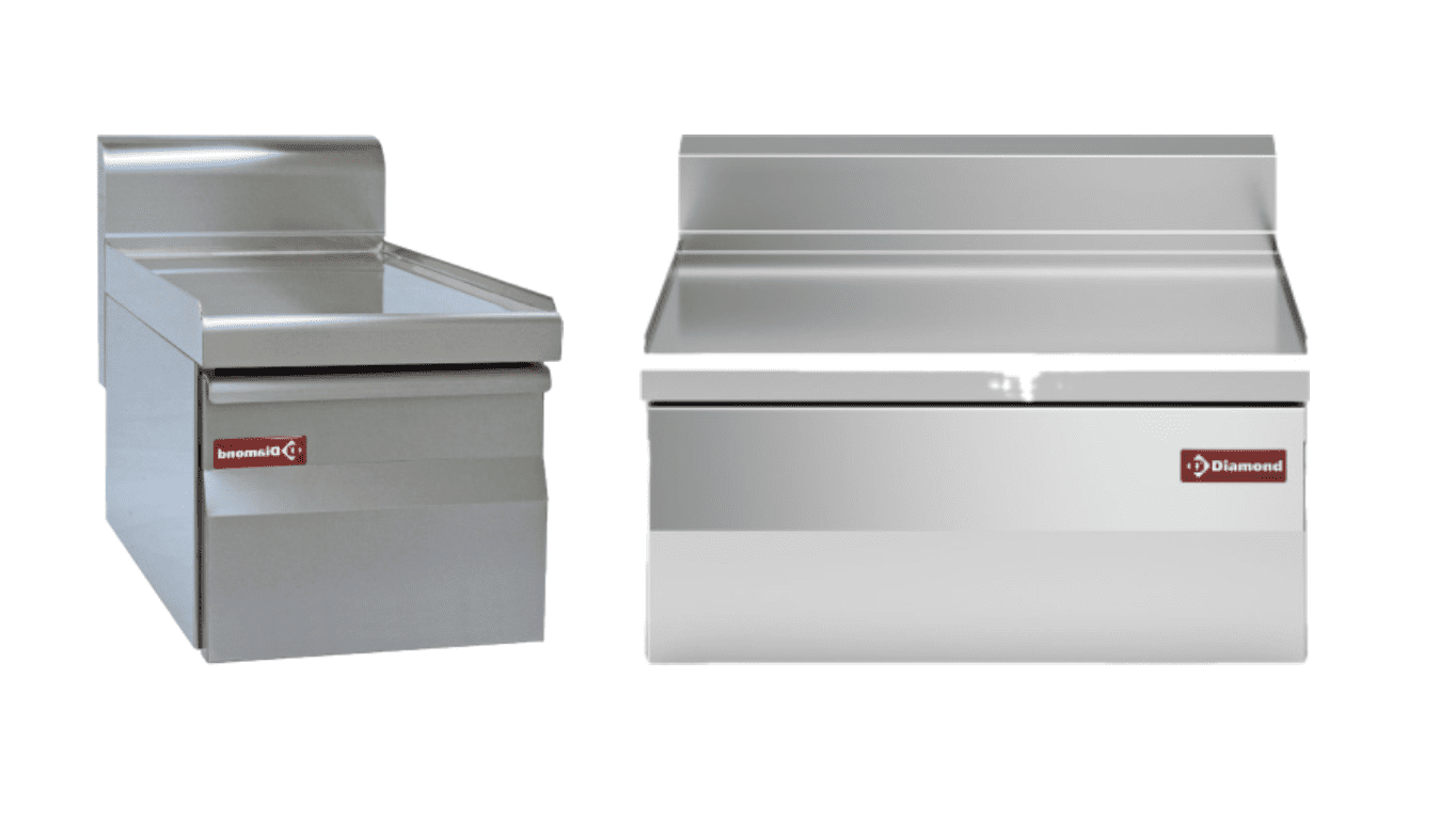 Surface de travail lisse. Sur la façade avant, il y a un tiroir coulissant sur glissières extractible pour un entretien facile, possibilité d’y insérer des bacs GN h150 mm.